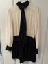En fejl på den ene knap, se billede. Stoffet er gået op omkring knappen. Ville kunne fikses - prisen er sat derefter. Dog ses dette ikke, hvis du bruger det smukke sorte tørklæde foran. Tørklædet kan også bindes som en sløjfe / butterfly i halsen efter behov.
